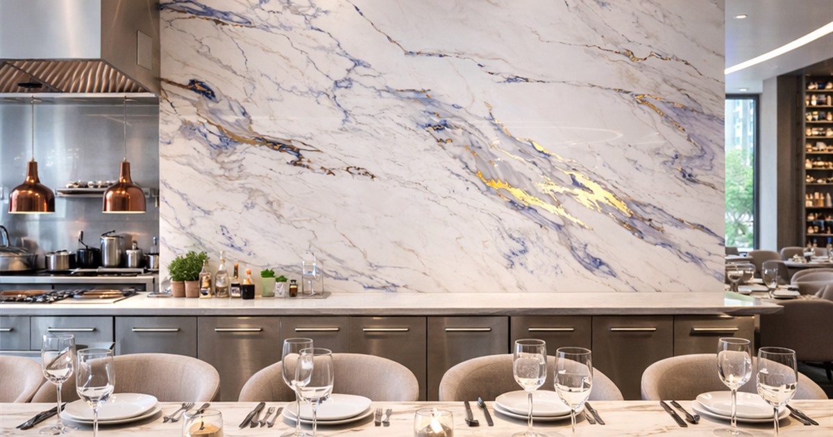 Formato 280×122 cm: poche giunzioni, effetto lastra uniforme. Nessuna interruzione come nelle mattonelle.